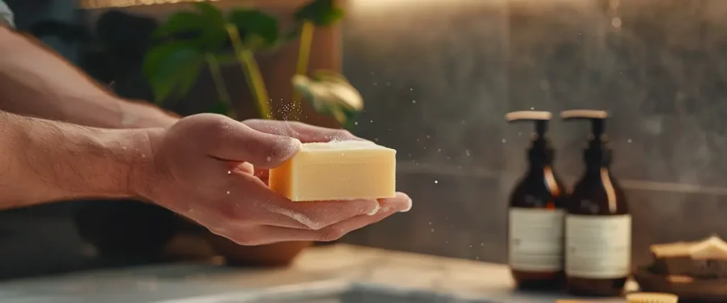 Eine hochwertige All-in-One-Duschseife ist die Basis. Sie sollte kaltgerührt sein, natürliche Öle enthalten und ohne aggressive Tenside auskommen. Achte auf einen angenehmen, nicht zu intensiven Duft – Sandelholz, Zirbenwald oder Limette sind beliebte Männerdüfte.